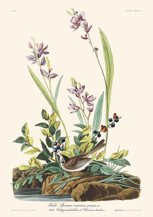 The depiction of the Field Sparrow is particularly notable for its graceful details, capturing the bird's delicate features and the subtleties of its habitat. Audubon's portrayal invites the viewer into a serene world where the rustling grasses provide sanctuary and sustenance for these tiny creatures.