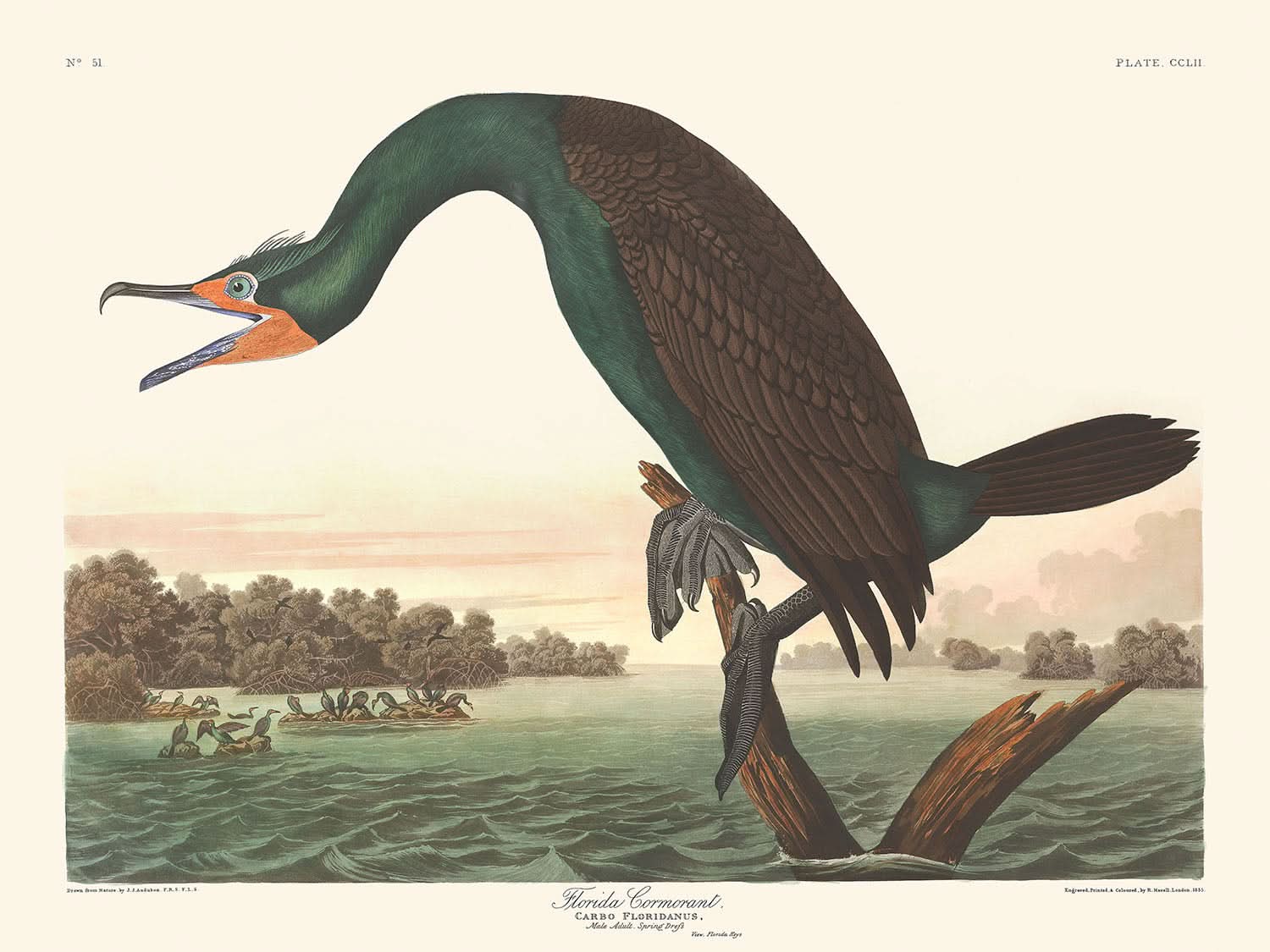 The Florida Cormorant (Plate 252) created by John James Audubon in 1827, is a remarkable illustration from his celebrated work, The Birds of America, capturing the essence of this distinctive bird species. Audubon, known for his rich naturalist legacy and his masterful depictions of birds, presents the Florida Cormorant in exquisite detail, set against a backdrop of its natural habitat, providing a vivid glimpse into the life of this often overlooked avian resident of America’s coastal regions.