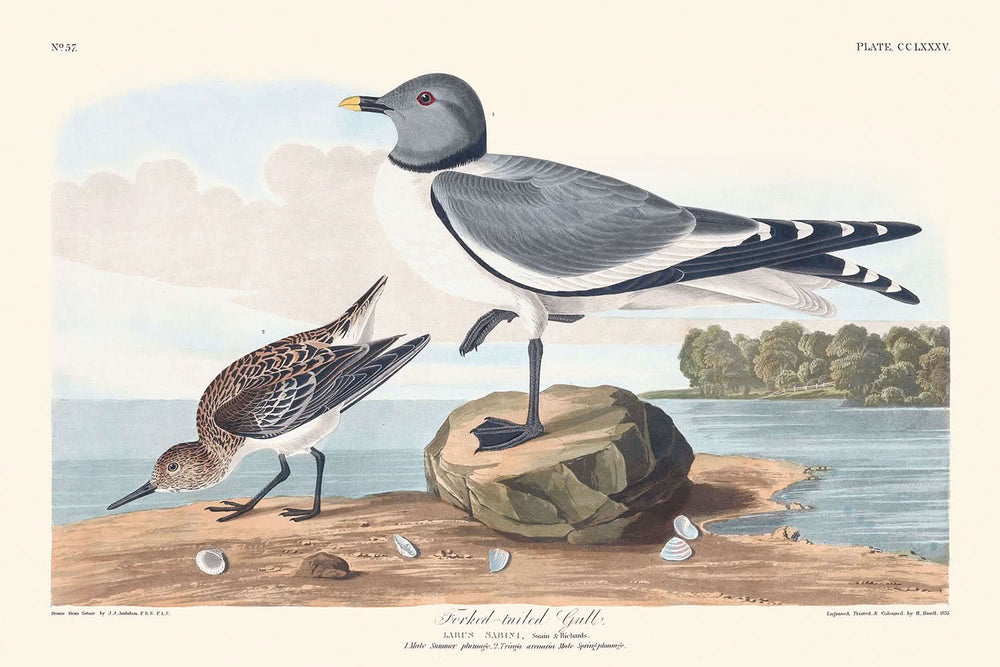 The Fork-tailed Gull print captures a species documented by Captain Edward Sabine, whose migratory patterns and habits are beautifully illustrated and described by Audubon. The interplay of whites, greys, and subtle hints of pink in the plumage offers a lifelike glimpse into this seabird's grace.