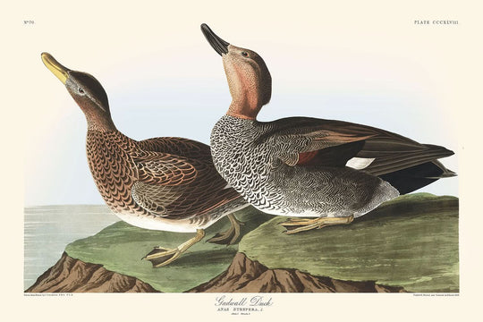 John James Audubon is celebrated for his extraordinary contributions to the world of bird illustrations. His monumental work, The Birds of America, featured 435 life-sized, hand-colored prints of American birds, many of which depicted species in their natural habitats. The "Gadwall Duck" is no exception, revealing Audubon’s keen eye for detail and deep understanding of the avian world.