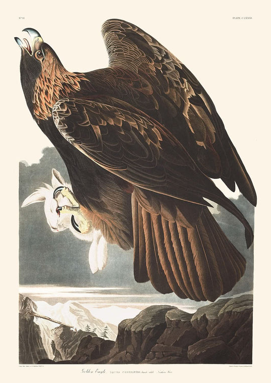 Golden Eagle, first published in 1827, is a striking and rare bird illustration created by the renowned naturalist and artist, John James Audubon. It comes from his magnum opus, The Birds of America, which is known for its detailed, life-sized depictions of North American birds. This particular illustration captures the majesty of the Golden Eagle, a majestic bird that Audubon found infrequently in the United States, often only sighting a pair in a year outside of mountainous regions or expansive plains.