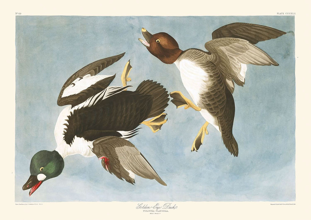Golden-Eye Duck (Plate 342) by John James Audubon is a captivating bird illustration originally published in 1827 as part of Audubon’s famous collection, Birds of America. This masterpiece highlights the renowned Golden-Eye Duck, an audacious traveler known for its extensive migrations across North America, from the icy northern latitudes to the broad bays of Massachusetts and the rice fields of South Carolina during winter.