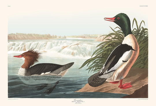 Goosander (a type of sea duck), first published in 1827, is one of the most colourful and interesting illustrations from John James Audobon's magnum opus, The Birds of America.