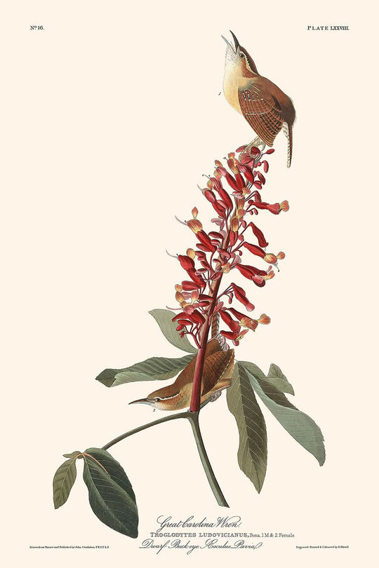 Adding the Great Carolina Wren to your collection provides not only a connection to Audubon's artistic legacy but also an appreciation for the natural beauty and behaviors of this charming bird. Its depiction on a blossomed dwarf buck-eye twig adds an element of botanical interest, with the flowers' muted tones complementing the vibrant wren.