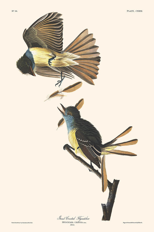 Great Crested Flycatcher, first published in 1827, is an exquisite example of avian illustration from John James Audubon’s monumental work, Birds of America. This print captures the unique spirit of the Great Crested Flycatcher, skillfully rendered in Audubon’s signature style, reflecting both artistic talent and scientific accuracy.