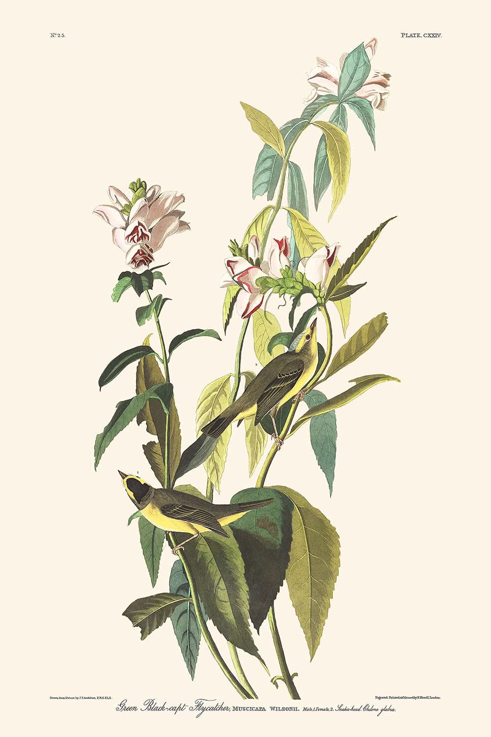 John James Audubon’s "Green Black-capt Flycatcher" (Plate 124), first presented in 1827, is an exquisite illustration from his renowned series, "Birds of America." This stunning depiction captures the intricate beauty and delicate nature of the Green Black-capped Flycatcher, showcasing Audubon's unparalleled ability to portray birdlife with vivid detail and lifelike vibrancy.