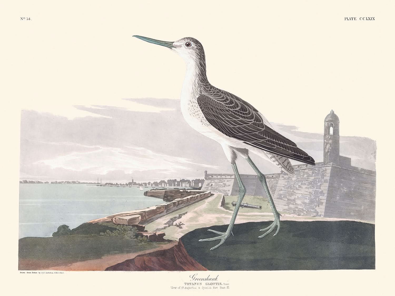Greenshank, painted by the legendary ornithologist John James Audubon in 1827, is part of his acclaimed series "Birds of America." This magnificent collection symbolizes one of the greatest works in ornithology and art, celebrated for its detailed, lifelike portrayals of avian subjects.