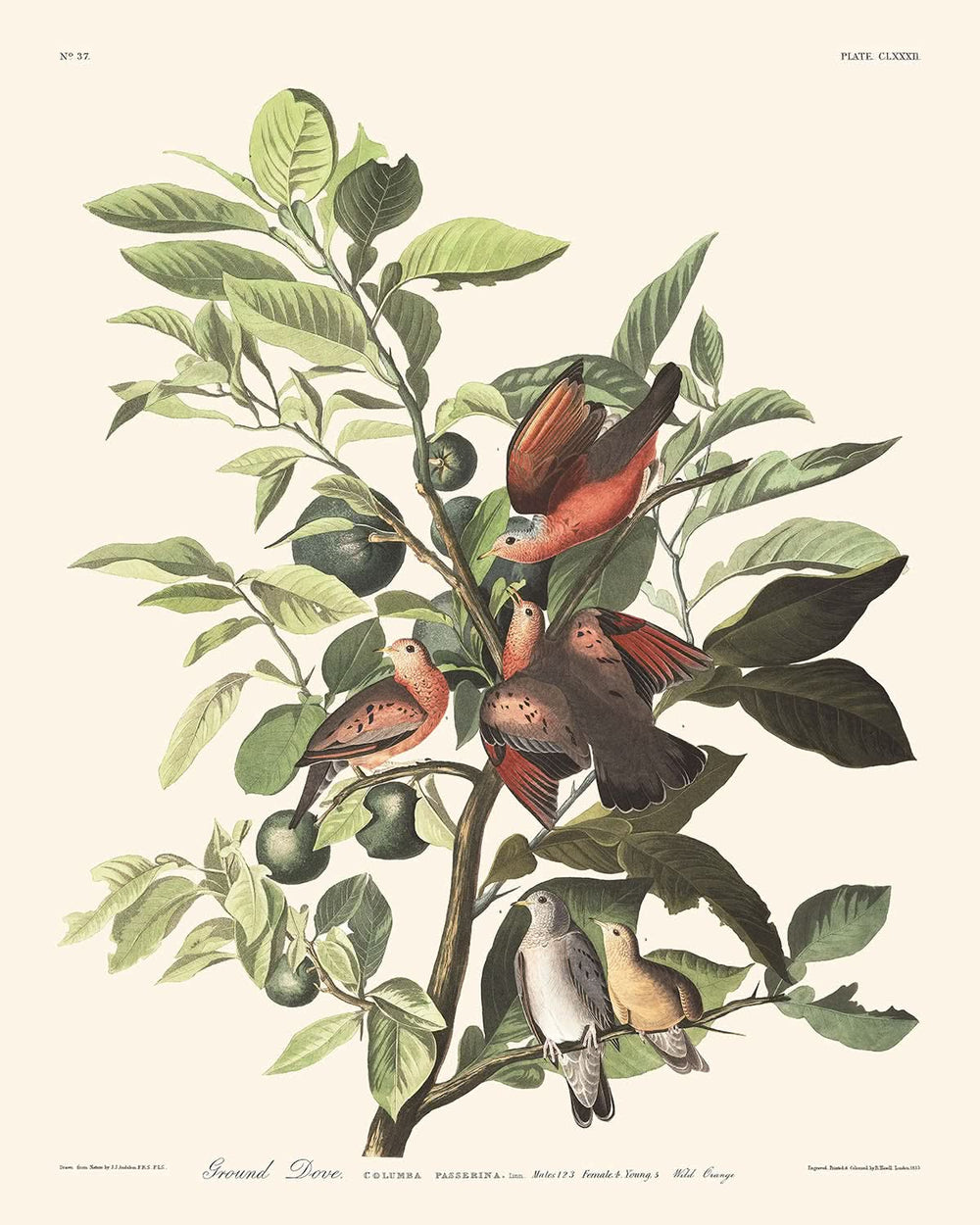 Ground Dove (Plate 182), illustrated by the renowned John James Audubon, is a captivating illustration featured in his monumental work, "The Birds of America," first published in 1827. This exquisite portrayal of the Ground Dove captures the essence of this species with remarkable detail, showcasing Audubon's profound artistry and dedication to depicting American avifauna.