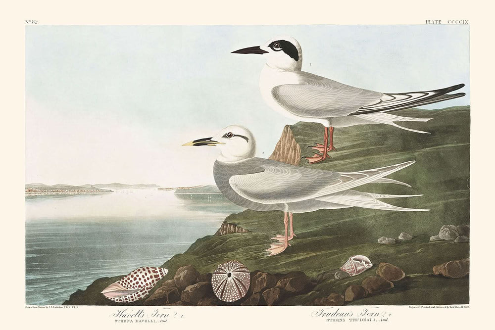 Havell's Tern and Trudeau's Tern, illustrated by John James Audubon in 1827, is a captivating addition to the collection of ornithological masterpieces in Audubon's renowned work, The Birds of America. This illustration captures the grace and elegance of these terns, particularly noted for their sleek forms and delicate plumage, as seen through Audubon's artistic lens.