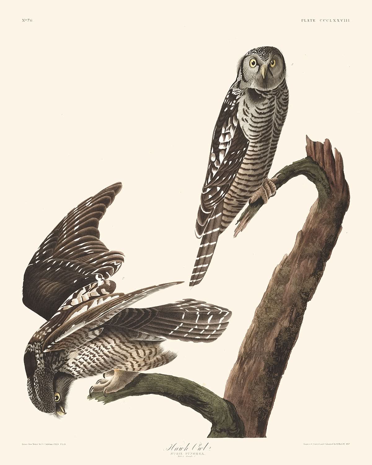 John James Audubon's "Hawk Owl" from 1827 is a captivating illustration that hails from his renowned "Birds of America" series. Audubon, an eminent ornithologist and naturalist, dedicated his life to documenting the avian treasures of North America, resulting in this remarkable collection of life-sized portraits. His work not only contributed significantly to ornithological studies but also captivated art lovers with its detailed elegance.