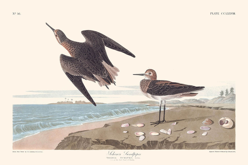 John James Audubon, a celebrated ornithologist and artist, is notable for his extensive study and artistic representation of North American birds. "Schinz's Sandpiper" holds particular significance due to Audubon's detailed narrative of the species, exemplifying his dedication to ornithology. The piece highlights the gentle nature and unique flight patterns of the Tringa Schinzii, as Audubon documented during his time in East Florida.