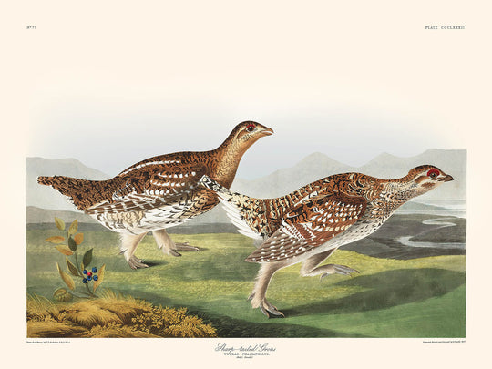 Sharp-tailed Grouse by John James Audubon, originally crafted in 1827, is a stunning bird illustration from Audubon's "Birds of America." Renowned for his detailed and lifelike depictions of birds, Audubon was a pivotal figure in American ornithology, and this piece exemplifies his commitment to both scientific accuracy and artistic beauty.