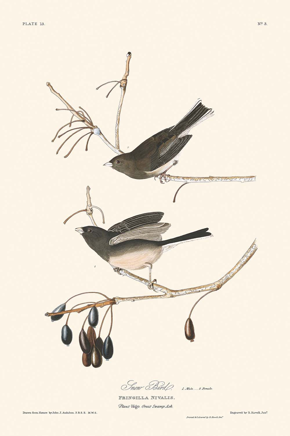 John James Audubon, a celebrated ornithologist, naturalist, and painter, is renowned for his extraordinary ability to document and illustrate North American bird species. This particular artwork is notable not only for its exquisite detail but also for the fascinating narrative Audubon provided about the Snow Bird's behavior and seasonal habits.