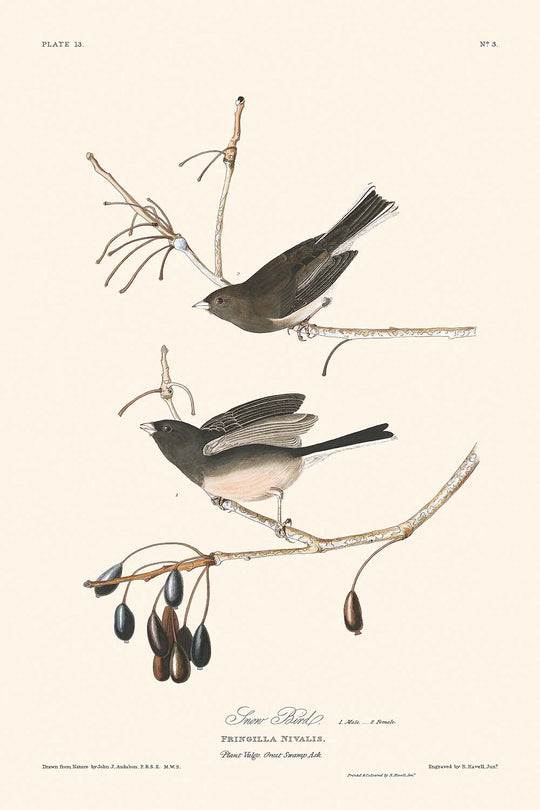 Introducing "Snow Bird" by John James Audubon, a timeless piece from the iconic "Birds of America" series initially published in 1827. This illustration captures an enchanting winter scene as detailed by Audubon, who observed this delicate bird, scientifically known as Fringilla hyemalis, in its migration from the north to the more temperate regions of Louisiana.
