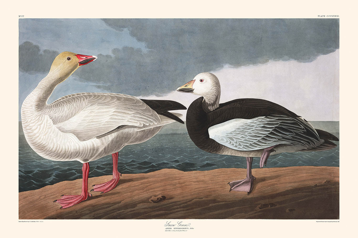 Created by the renowned artist John James Audubon, "Snow Goose (Plate 381)" is an exquisite bird illustration from his celebrated series, "Birds of America." Published in 1827, this artwork captures the snow goose, known scientifically as Anser hyperboreus, with remarkable detail and artistry. Audubon, an iconic figure in ornithology and naturalist artistry, devoted his life to chronicling the birds of North America, pioneering a distinctive blend of scientific accuracy and artistic skill.