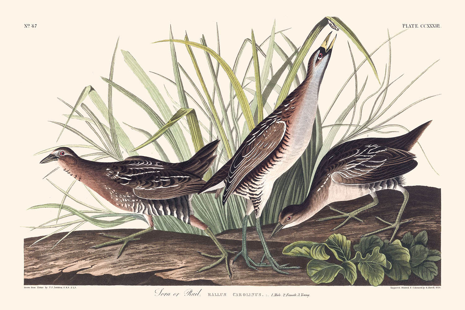 John James Audubon's sublime "Sora, or Rail" from 1827 is a quintessential illustration from his renowned series, "Birds of America." Audubon, a pioneering ornithologist and artist, meticulously illustrated the rich avian life of North America, bringing to life their diverse habitats and vibrant behaviors. This print captures the fascinating Sora, scientifically known as Rallus carolinus, observed mainly around the marshy landscapes, an environment Audubon was deeply familiar with due to his extensive explorations.