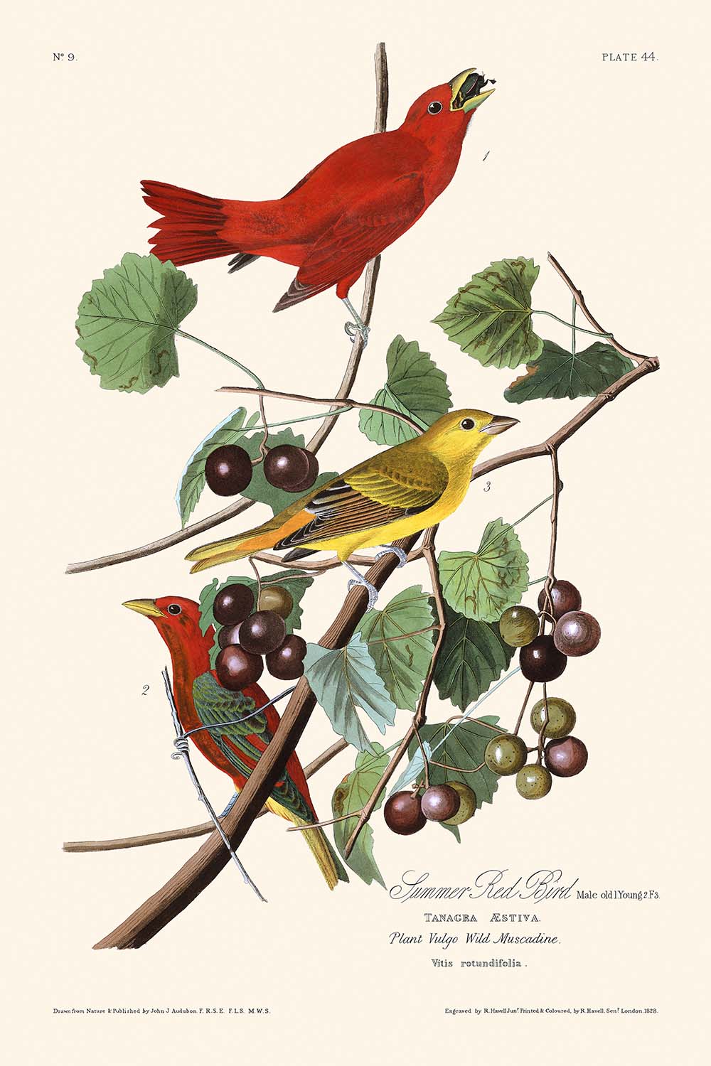 The "Summer Red Bird" illustration stands out for its meticulous attention to detail and Audubon's use of vibrant vermilion in depicting the male bird in full plumage, juxtaposed against the earthy greens of the female and immatures. The scene is enhanced by the cascading grape vines, the distinctive thick-skinned Muscadine (Vitis rotundifolia), which adds texture and realism to the composition. This stunning use of color and intricate detail offers an extraordinary display of Audubon’s craftsmanship.