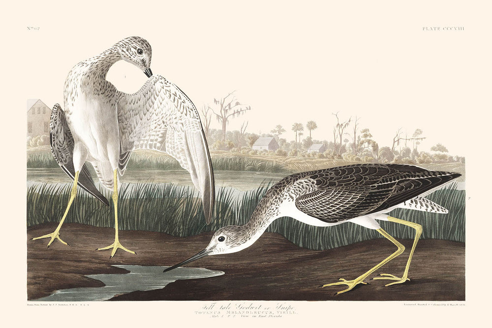 Immerse yourself in the extraordinary world of avian art with "Tell-tale Godwit, or Snipe" (Plate 308) by the illustrious John James Audubon, originally published in 1827. A revered work from Audubon's renowned series, "Birds of America," this piece encapsulates the intricate beauty and delicate dynamism of the Tell-tale Godwit, surrounded with remarkable details that showcase not only the artist's skill but also his deep appreciation for nature's wonders.