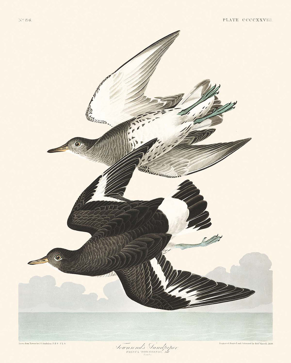 Introducing Townsend's Sandpiper, a beautiful bird illustration by the renowned John James Audubon. Created in 1827 as part of his masterwork, "The Birds of America," this artwork captures the elegance and intricate details of the bird species native to North America. Audubon, a celebrated naturalist and painter, devoted much of his life to studying and illustrating the diverse avian life of the continent, and his collection remains a seminal reference for ornithologists and art lovers alike.