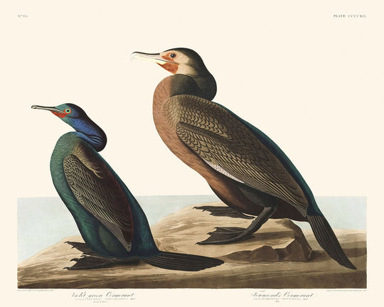 Violet-green Cormorant and Townsend's Cormorant (Plate 412), masterfully illustrated by John James Audubon, represents a remarkable piece from his celebrated series, The Birds of America. Created and published in 1827, this artwork captures the vivid beauty of these species with Audubon's characteristic detail and precision, presenting the cormorants in lifelike proportions and hues that reflect their real-world elegance.