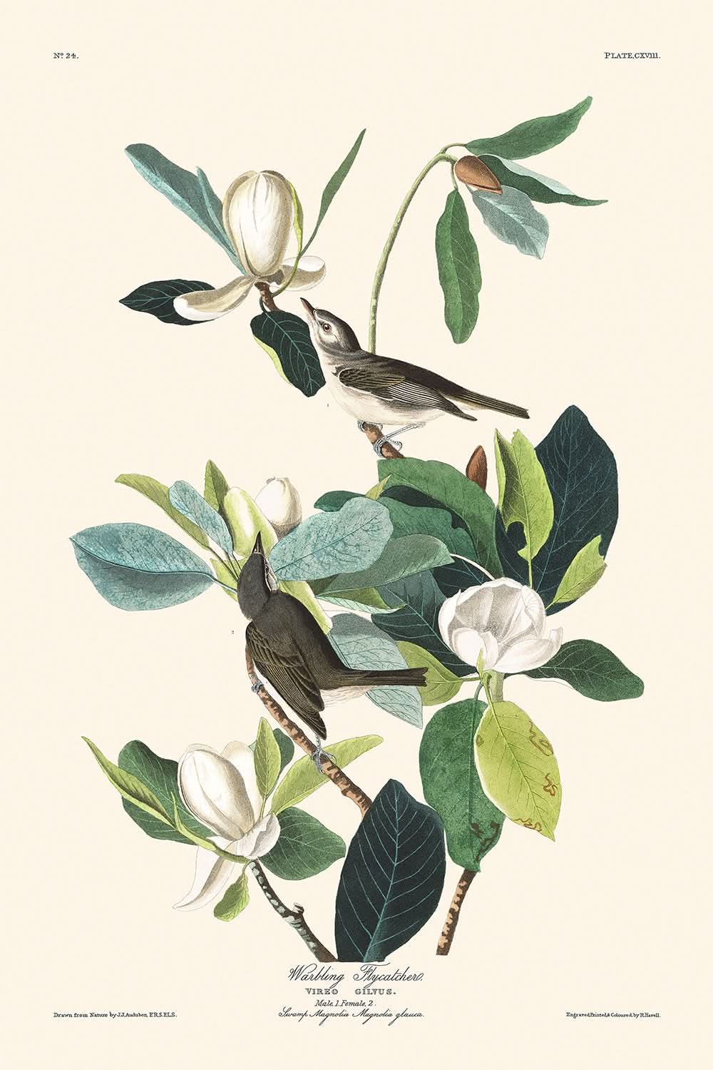 Warbling Flycatcher (Plate 118) by John James Audubon was first published in 1827 as part of the renowned Birds of America series. This exquisite illustration captures the delicate beauty of the Warbling Flycatcher, also known scientifically as Vireo gilvus. It is a testament to Audubon's ability to depict the intricate details and vibrant spirit of avian life.