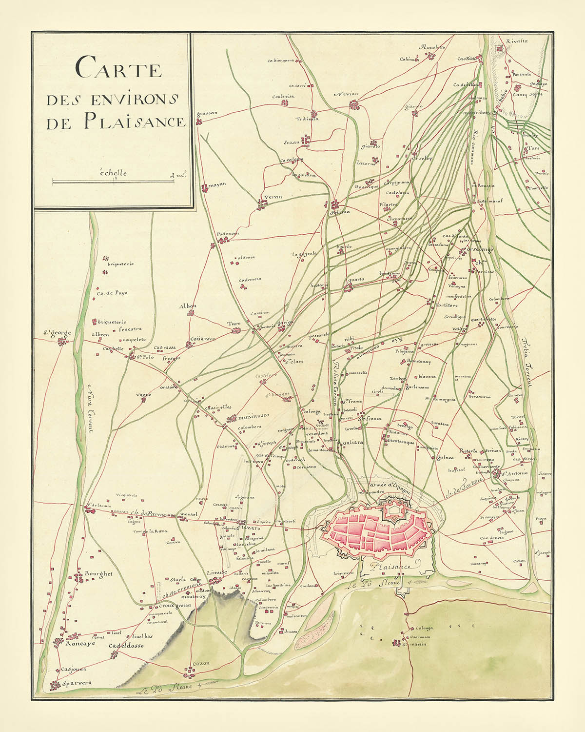 Discover the meticulously detailed "Carte des environs de Plaisance," a historical copperplate engraving created anonymously in 1746. This artwork offers a snapshot of the region south of the Po River and between the Trebbia and Torrente Nure rivers during the War of Austrian Succession, likely connected to the Battle of Piacenza on June 16, 1746.