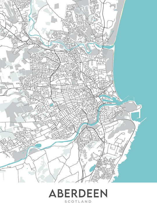 The inclusion of prominent landmarks like Aberdeen Beach, Duthie Park, and Marischal College adds a layer of depth to this piece of art. These landmarks are not merely points on a map but symbols of the city’s rich cultural and historical tapestry. The River Dee and River Don, flowing gracefully through the city, are also depicted, adding a natural element that contrasts beautifully with the structured urban grid. This blend of natural and man-made features makes the map a balanced representation of Aberdeen’s unique character.