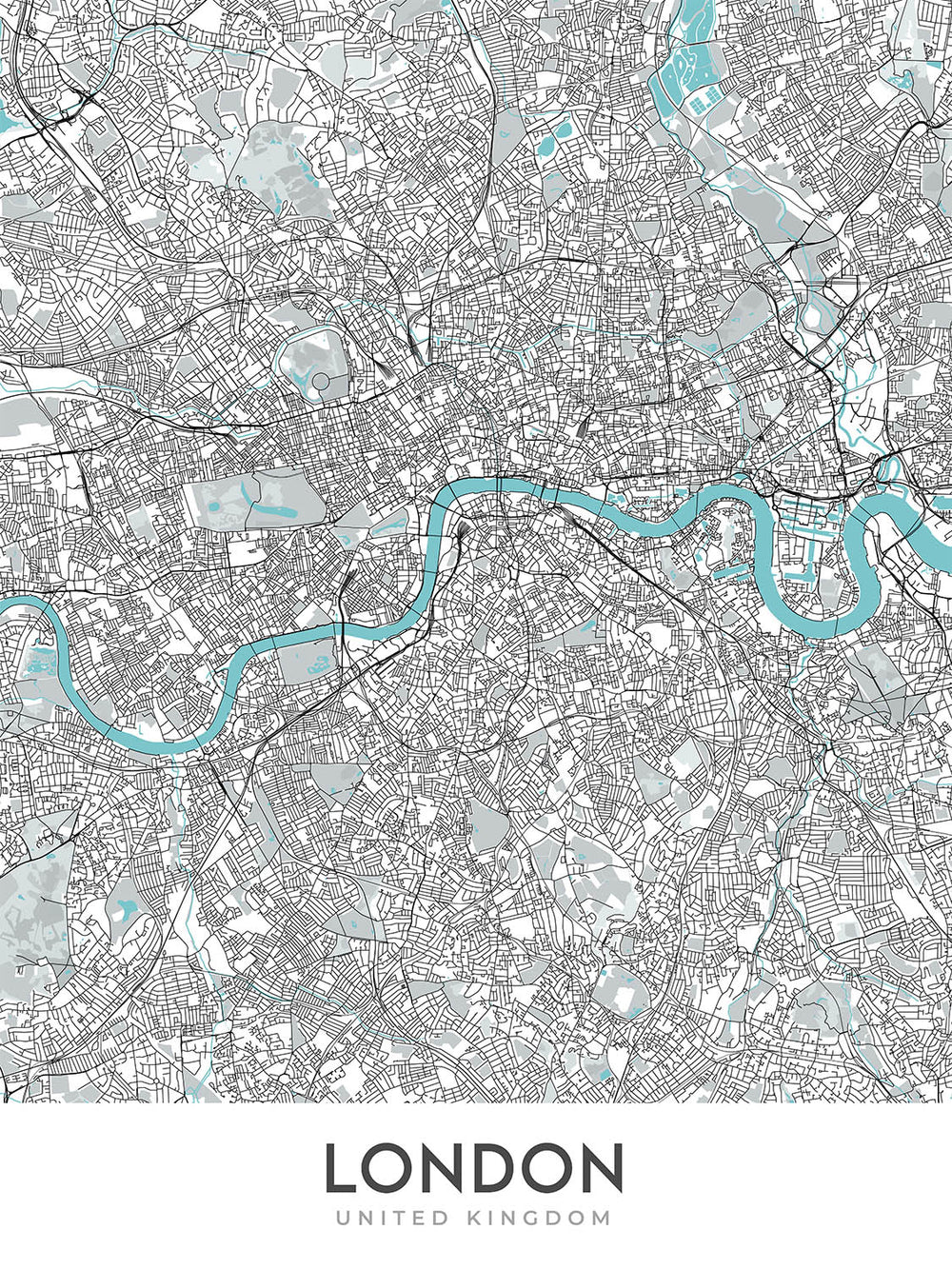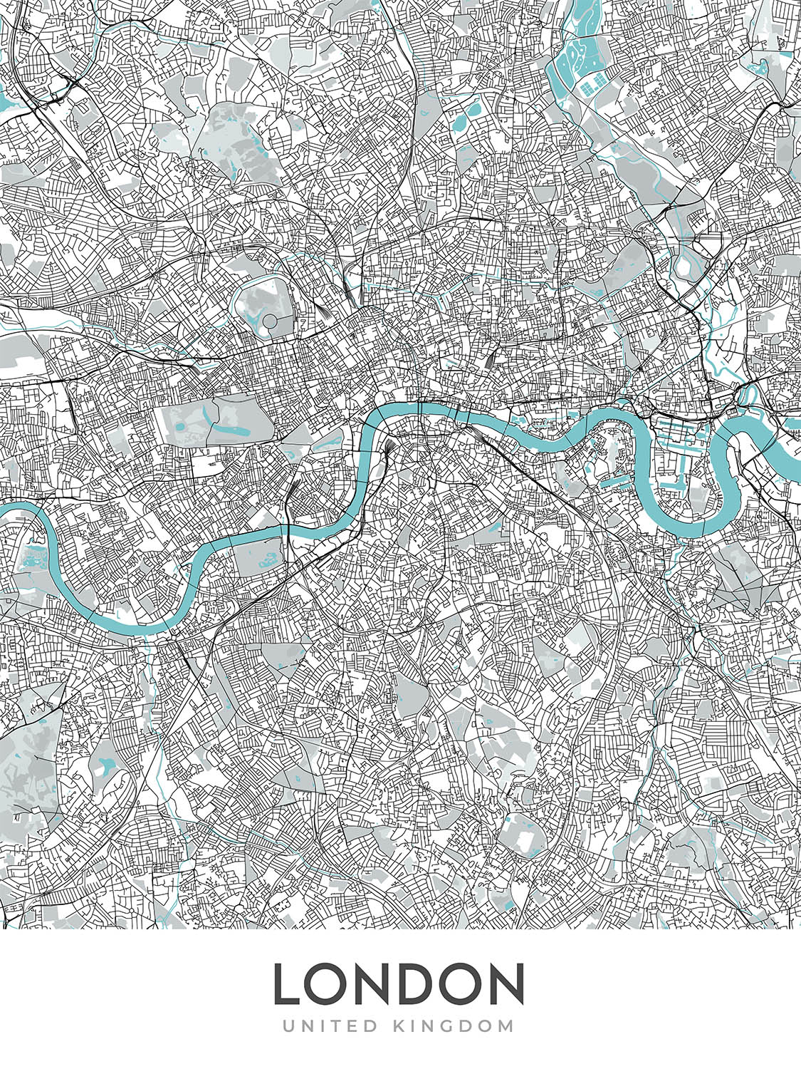 This map of London is a modern and detailed street map without labels, perfect for those who want a stylish and informative piece of art for their home or office. The map covers a large area of the city, including many of the most popular neighborhoods and landmarks.