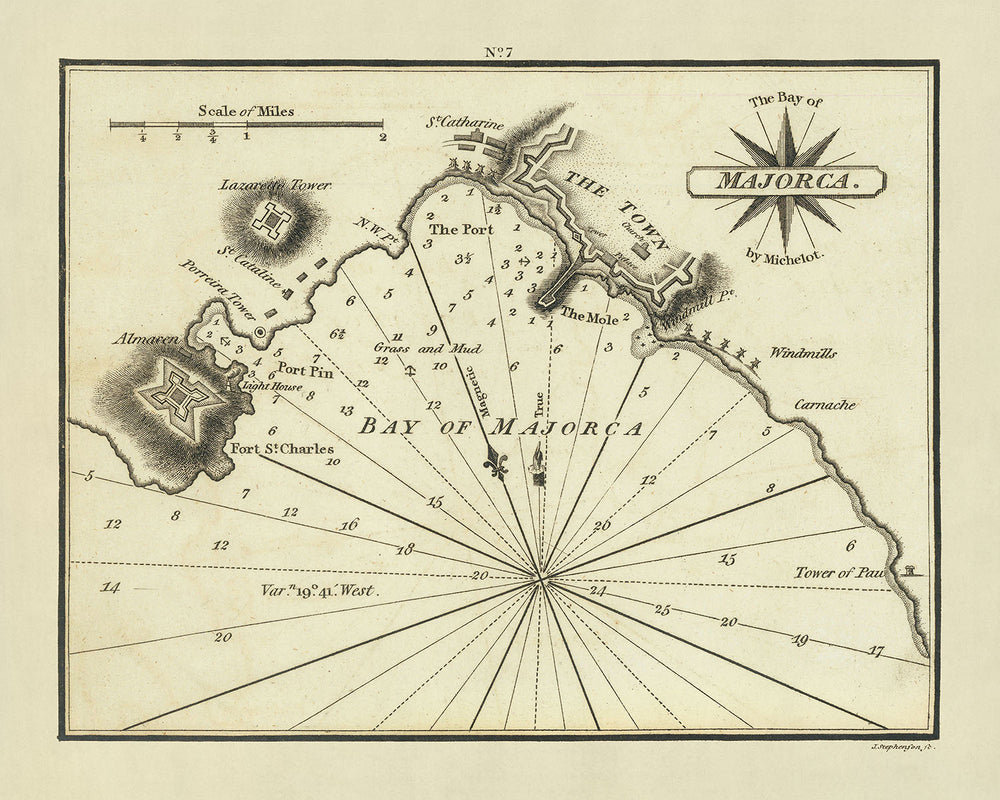 Old Bay of Majorca Nautical Chart by Heather, 1802: Lazarette Tower, Porreira Tower, Almacen
