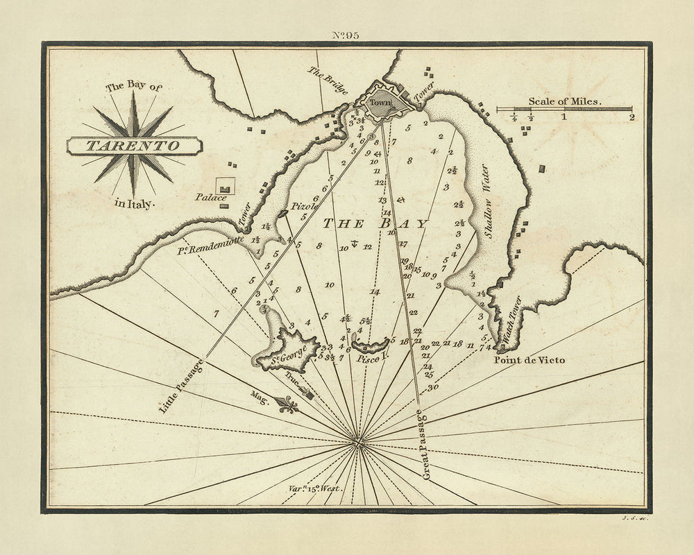 Old Bay of Taranto, Italy Nautical Chart by Heather, 1802: Gulf of Taranto, Ionian Sea, Strait of Otranto