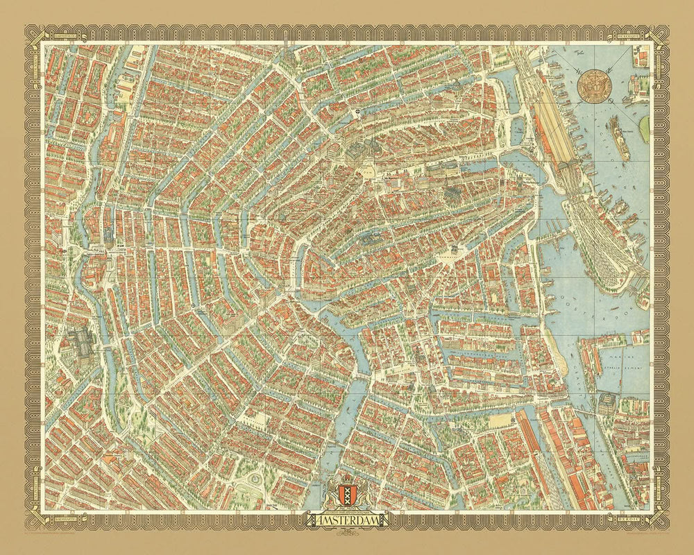 Amsterdam's city center unfolds in exquisite detail, showcasing significant neighborhoods like the Jordaan and De Pijp. These areas, known for their rich history and cultural vibrancy, are beautifully rendered, highlighting the city's unique blend of old-world charm and modern dynamism. The map vividly portrays the labyrinthine network of canals, which are the lifeblood of Amsterdam, offering a glimpse into the city's storied past and its evolution over the centuries.