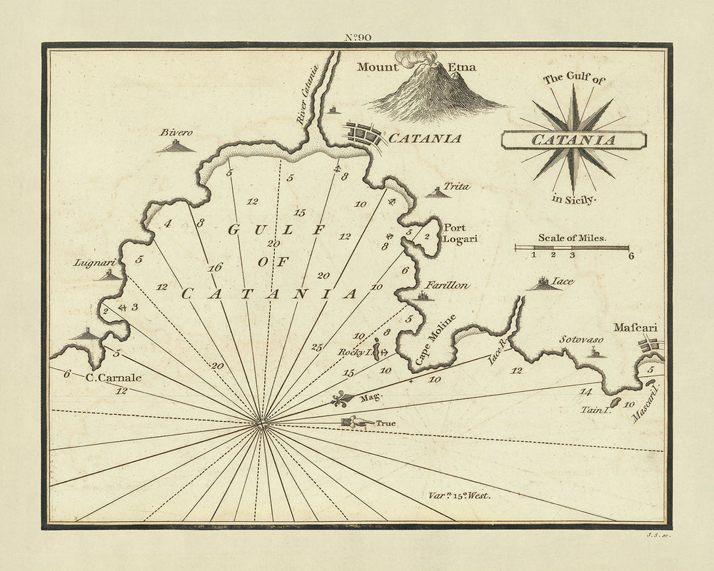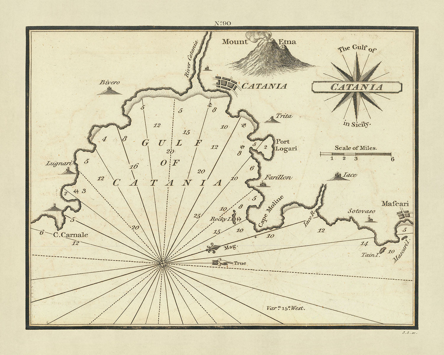 Old Gulf of Catania, Sicily Nautical Chart by Heather, 1802: Mount Etna, Italy, Cape Carnale