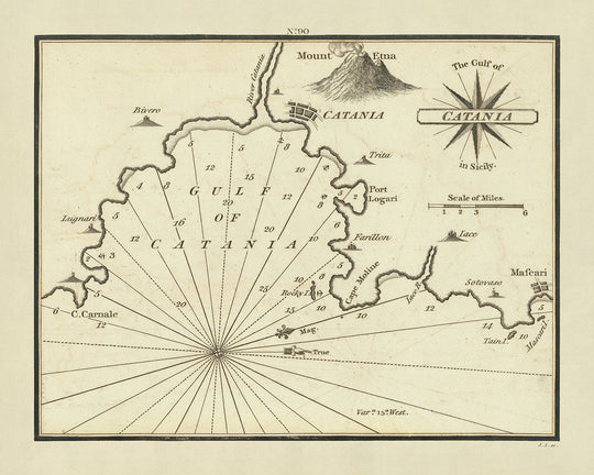 This chart is distinguished by its orientation, with west at the top, a unique feature that sets it apart from conventional maps. It meticulously details the coastline of the Gulf of Catania, marking significant locales such as Catania itself, Aci Castello, and Aci Trezza. Notably, it captures the majestic presence of Mount Etna, an iconic landmark whose representation adds both geographical and cultural depth to the chart. The inclusion of soundings, topographical features, and anchorages enriches its utility and historical value, making it an indispensable resource for understanding the maritime landscape of the time.