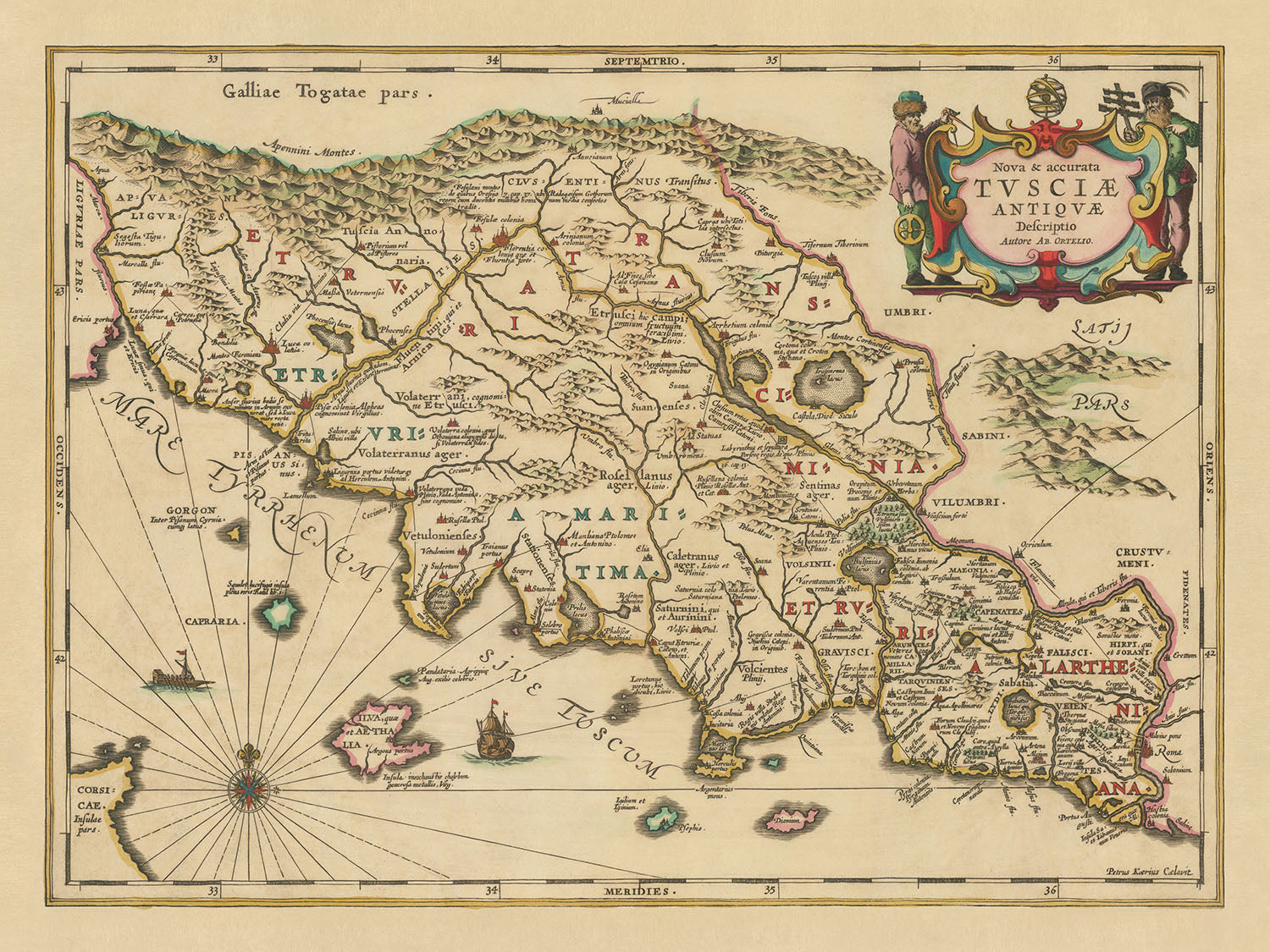 Old Map of Ancient Tuscany by Jansson, 1652: Etruscan City-States, Lazio, Umbria, Roman Settlements & Roads, Apennines, Arno River