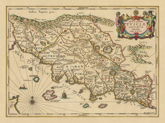 The map's attention to detail, combined with its historical and geographical relevance, makes it a remarkable piece. It provides a fascinating glimpse into the past, from the era of the Etruscans to the height of the Roman Empire. This, coupled with the meticulous craftsmanship of Jan Jansson, one of the period's foremost cartographers, makes the 'Nova et accurata Tusciae Antiquae Descriptio' a valuable addition to any collection. Whether for a lover of history, a connoisseur of cartography, or simply someone who appreciates the beauty of Tuscany, this map offers a unique and captivating perspective of this remarkable region.
