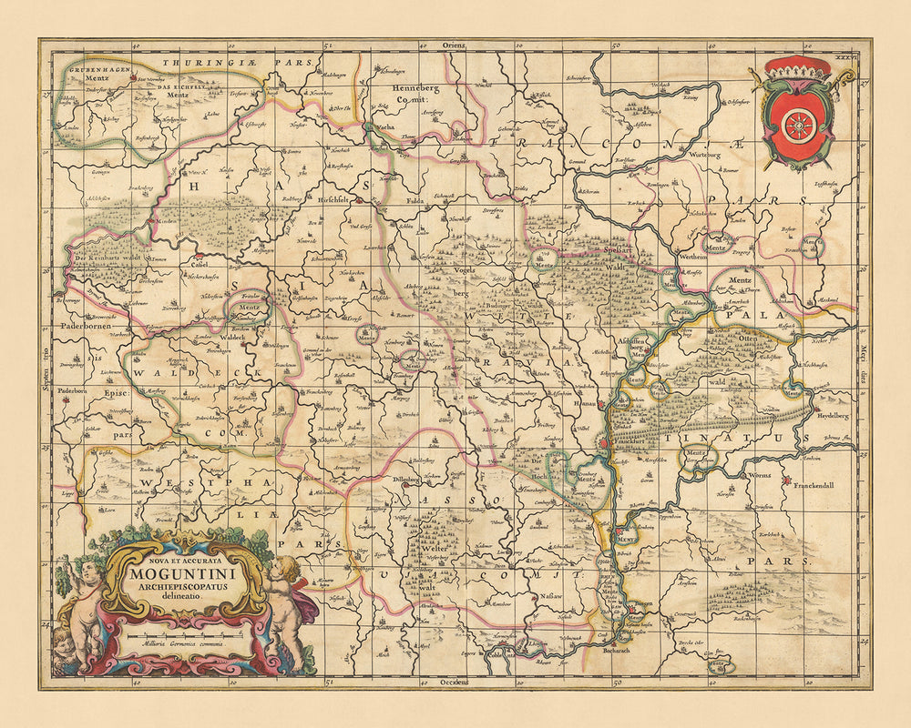 This remarkable piece, 'Nova Et Accurata Moguntini Archiepiscopatus delineatio', or in English, 'New and Accurate Delineation of the Archbishopric of Mainz', is a stunning representation of the Archbishopric of Mainz, an important ecclesiastical principality of the Holy Roman Empire, located in the larger modern day area of Germany. Crafted by Nicolaes Visscher II in 1690, it offers a unique perspective into the political and geographical landscape of the time.