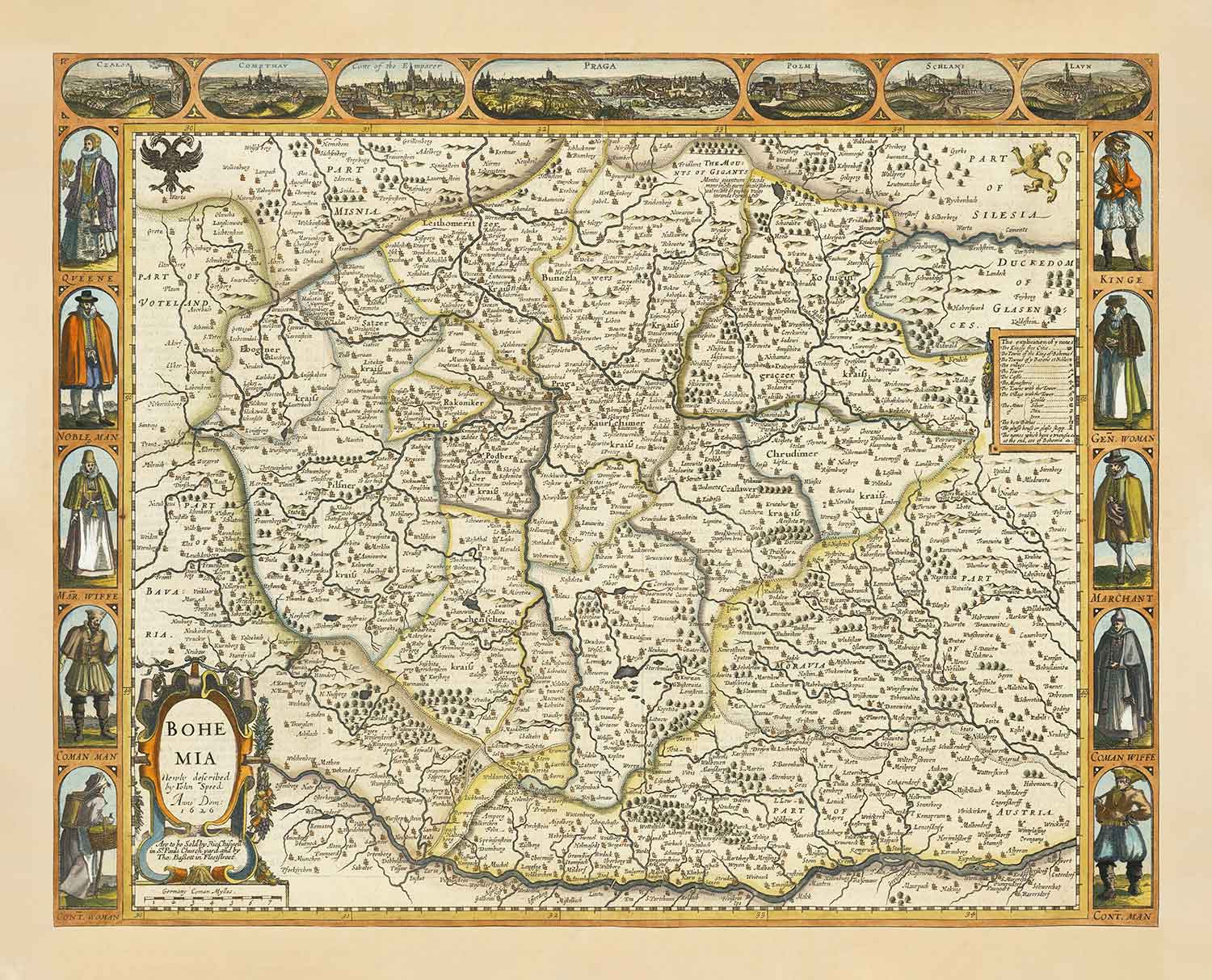 This old, handcoloured and wonderful map shows the Kingdom of Bohemia in 1626. It was created by John Speed.