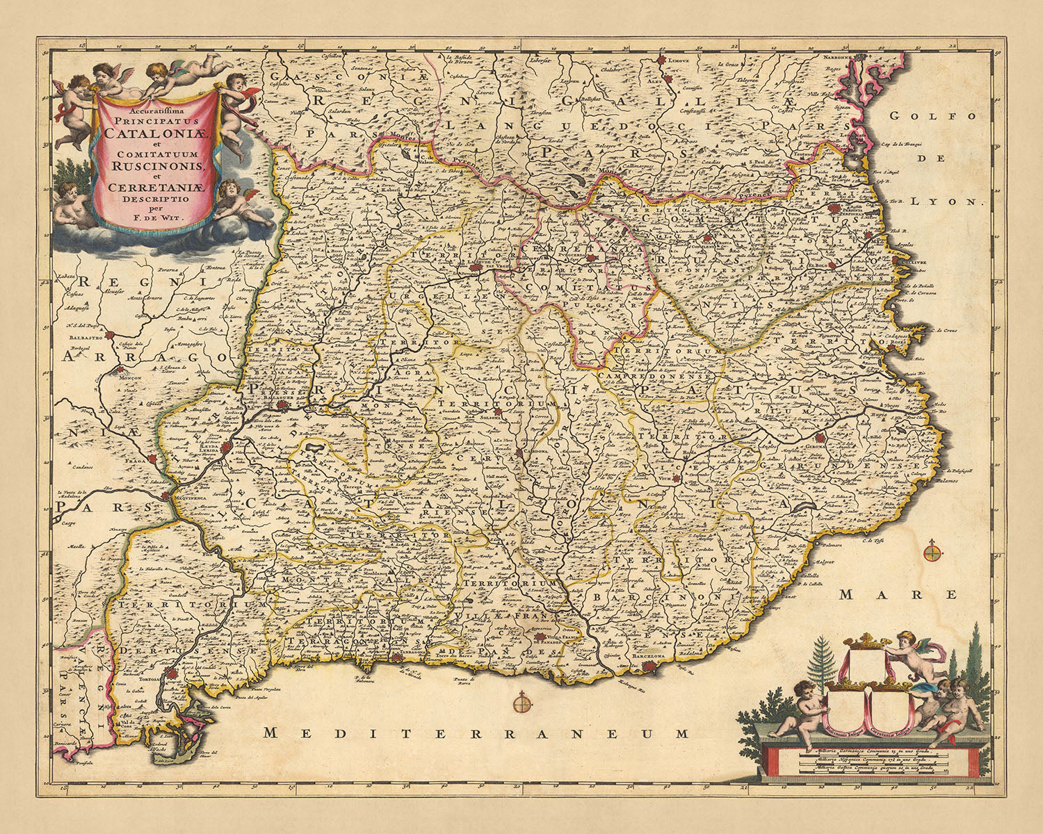 Hand-colored and engraved, the 'Accuratissima principatus Cataloniae et comitatuum Ruscinonis, et Cerretaniae descriptio' is more than a map—it's a work of art. The relief shown pictorially brings a unique depth to the landscape, making this map a truly immersive experience. As you delve into the details of this exquisite piece, you'll discover a rich tapestry of history, culture, and geography that is sure to captivate any lover of cartography or history.