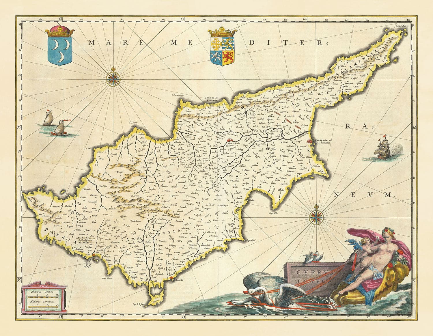 Old Map of Cyprus by Willem Blaeu, 1640: Nicosia, Kyrenia, Famagusta, Limassol, Pafos, Larnaca