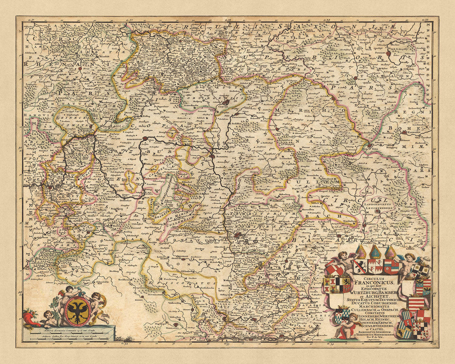 In the hands of Nicolaes Visscher II, one of the most renowned mapmakers of the Dutch Golden Age, the Franconian Circle comes to life with an extraordinary level of detail and precision. This map is not only a work of art, but also a historical document that offers a unique perspective on a fascinating period in European history. It is a perfect addition for collectors, history enthusiasts, or anyone with a deep appreciation for the artistry and craftsmanship of antique maps.