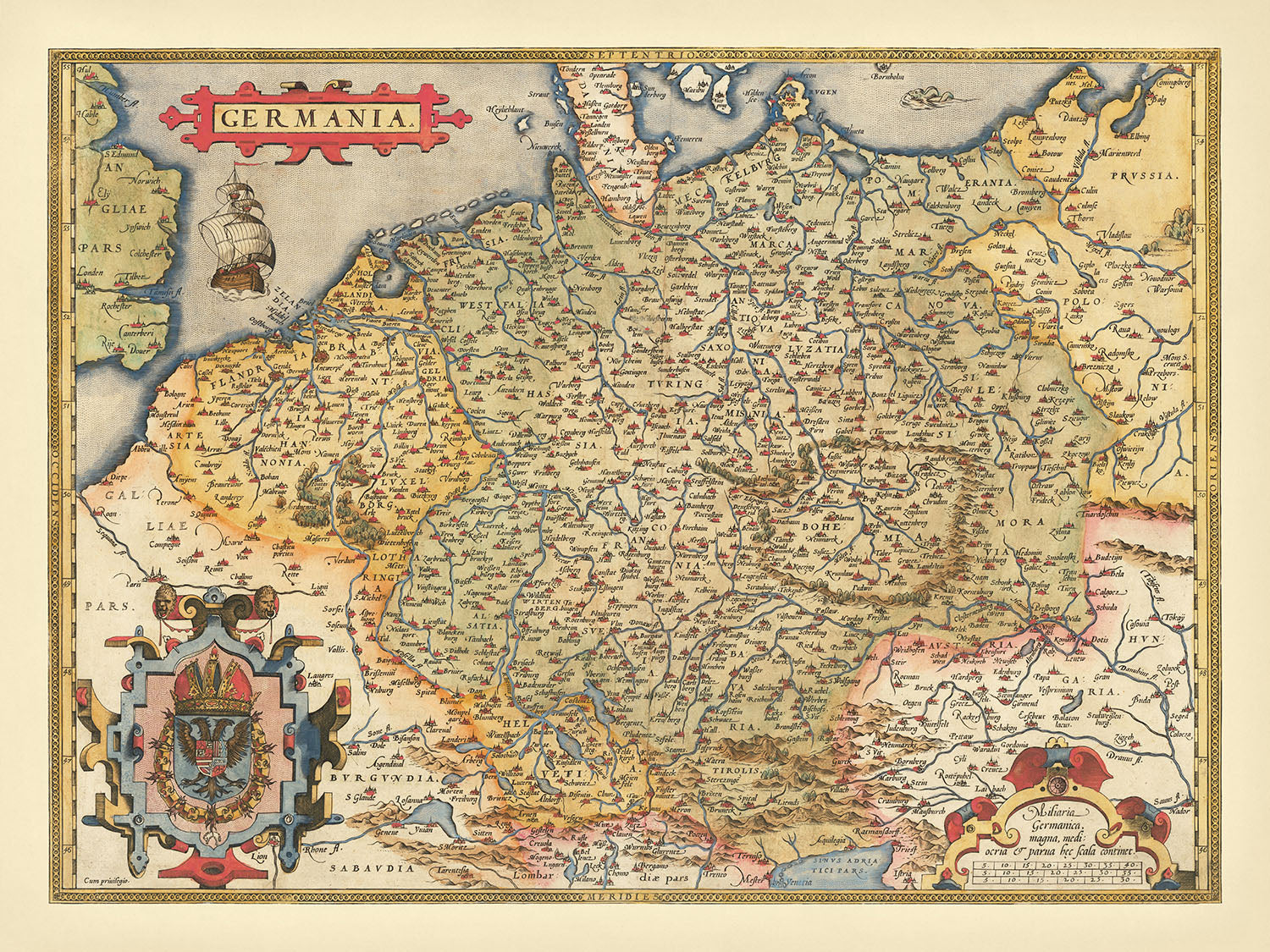 Old Map of Germany, the Holy Roman Empire by Ortelius, 1573: Germania, Poland, Rhine, Elbe, Danube, Alps, Baltic Sea