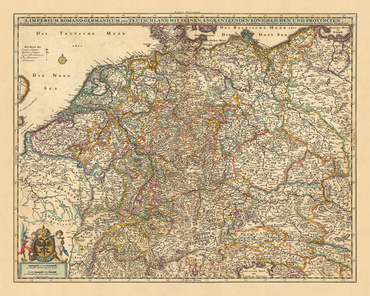 This exquisitely detailed map, titled 'S. Imperium Romano-Germanicum: oder Teutschland mit seinen angrantzenden Konigreichen und Provincien', is a testament to the cartographic skills of Nicolaes Visscher II, a renowned mapmaker from the Dutch Golden Age. The title, translated into English, reads 'The Holy Roman Empire: or Germany with its adjoining Kingdoms and Provinces', and it encapsulates the vast expanse of Central Europe that the map covers.