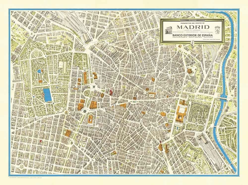 A rare and beautiful map of Madrid originally published in 1966 by Jorge Guzmán Hernández. This map is drawn in an isometric style so that you can see the wonderful details and architecture of Madrid's landmark buildings.