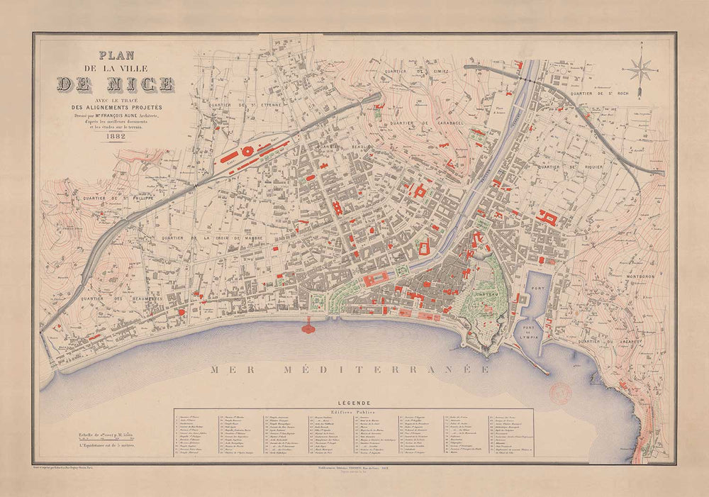 This wonderful old map of Nice was originally published in 1882. It was created by Francois Aune.