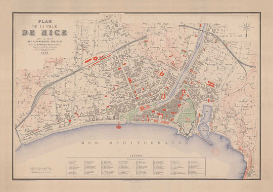 When this map was published, the city finally found itself under French control after centuries of being traded between invaders who were drawn to the city due to its strategic position on the Mediterranean. In the late 19th century, Nice became a destination for wealthy English visitors, hence why there's an area called "Promenade des Anglais" on the coast of this map.
