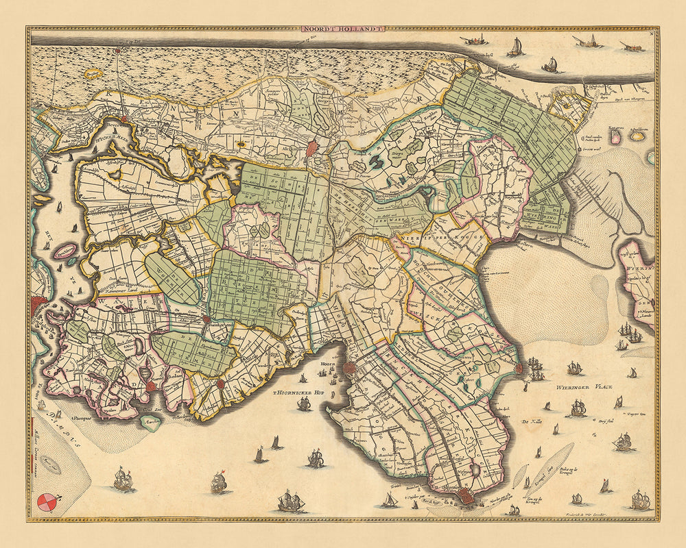 This 'Noordt Hollandt' map by Nicolaes Visscher II is a must-have for any history or cartography enthusiast. It is a unique piece that combines historical significance, artistic craftsmanship, and geographical detail, offering a window into the past of one of Europe's most fascinating regions.