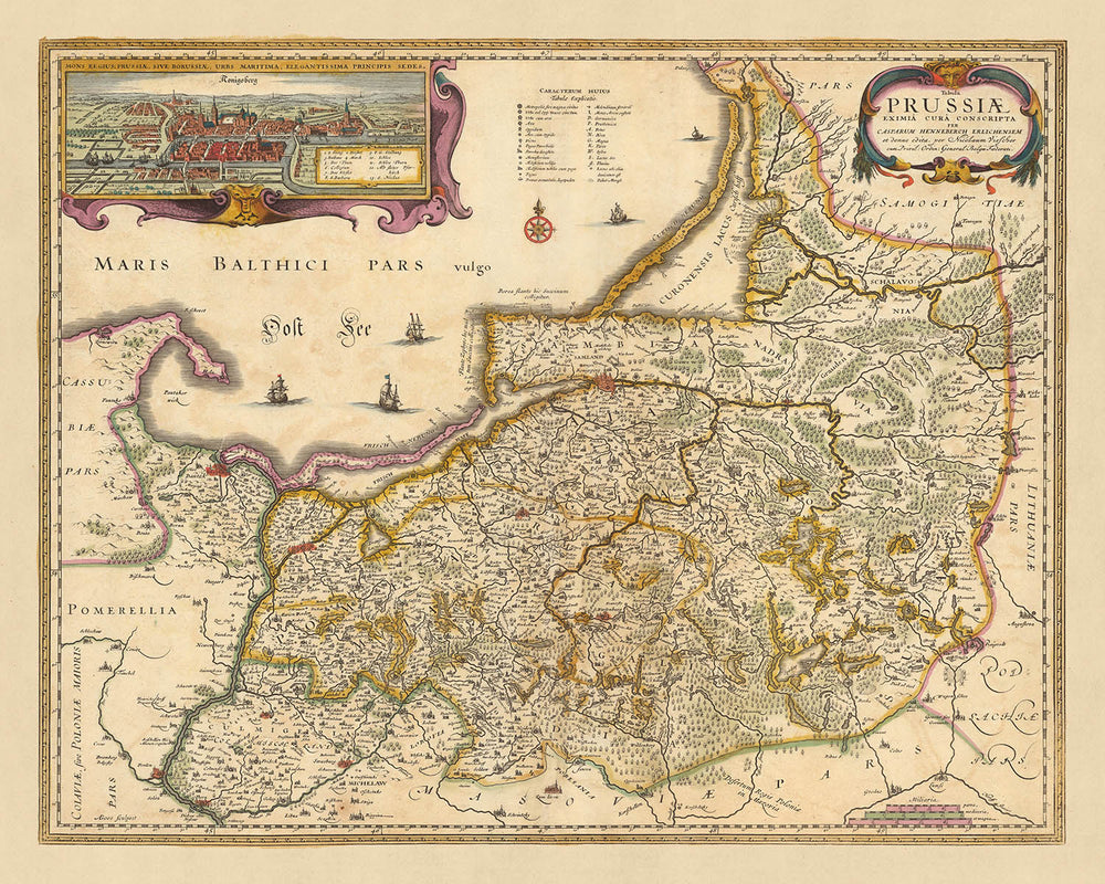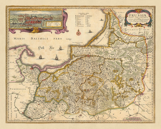 The map, in Latin, is translated to 'Map of Prussia, with inset illustration of the city of Konigsberg'. It offers a wealth of information about the political divisions and regions of the time. The focus of the map is on Prussia, providing an intriguing glimpse into the geopolitical landscape of the 17th century.