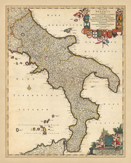 Discover a piece of history with this exquisite map titled 'Regnum Neapolis : in quo sunt Aprutium Ulterius et Citerius, Comitatus Molisius, Terra Laboris, Capitaniata Principatus Ulterior et Citerior Terra Bariensis et Hidruntina Basilicata, Calabria Citerior et Ulterior'. In English, this translates to 'Kingdom of Naples: in which there are Aprutium Further and Nearer, County of Molise, Land of Labor, Captaincy of the Further and Nearer Principality, Land of Bari and Hydruntum, Basilicata, Calabria Nearer and Further'. This map, created by Nicolaes Visscher II in 1690, provides a detailed view of the Kingdom of Naples and its surrounding regions, a significant area of modern-day Italy.
