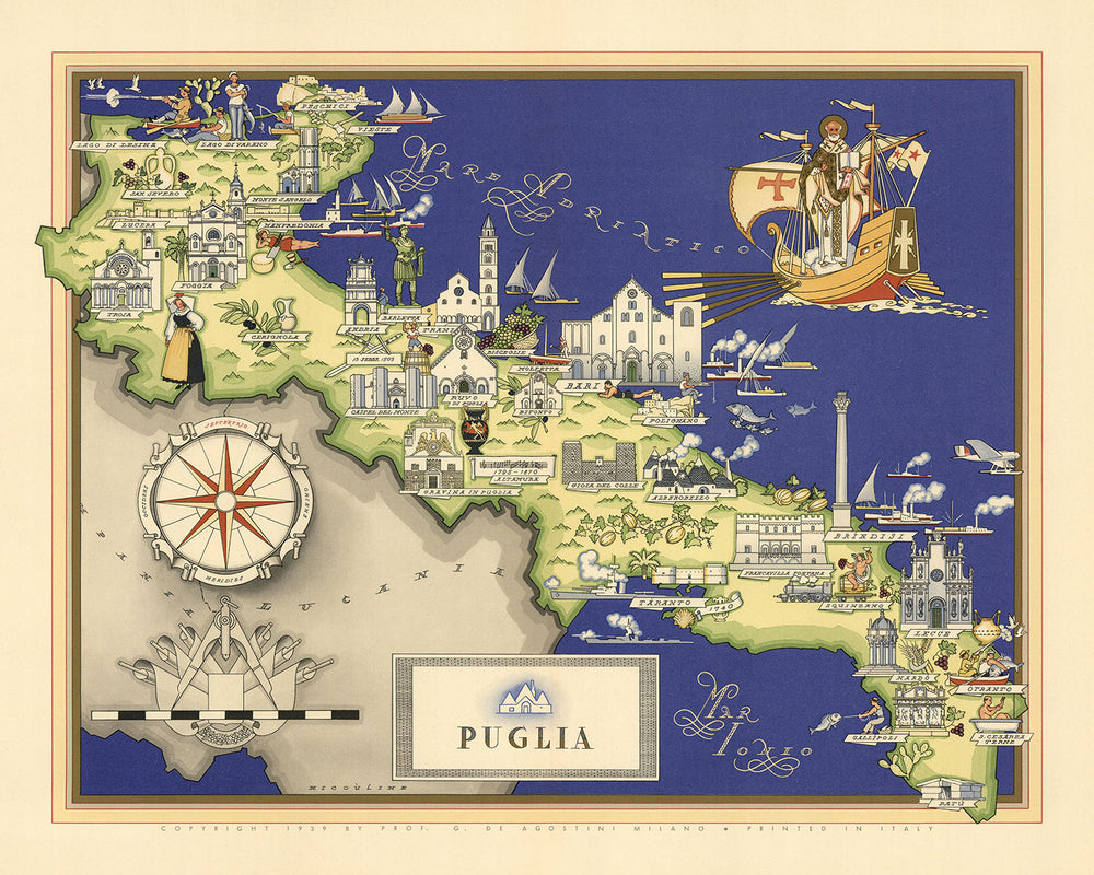 This Italian Region of Puglia map, originally published in 1938 by the Italian cartographic company, Giovanni De Agostini, is a beautiful and detailed example of a thematic and pictorial map. The map's main focus is the Italian Region of Puglia, a region in southeastern Italy, known for its rich history, stunning architecture, and breathtaking natural beauty.