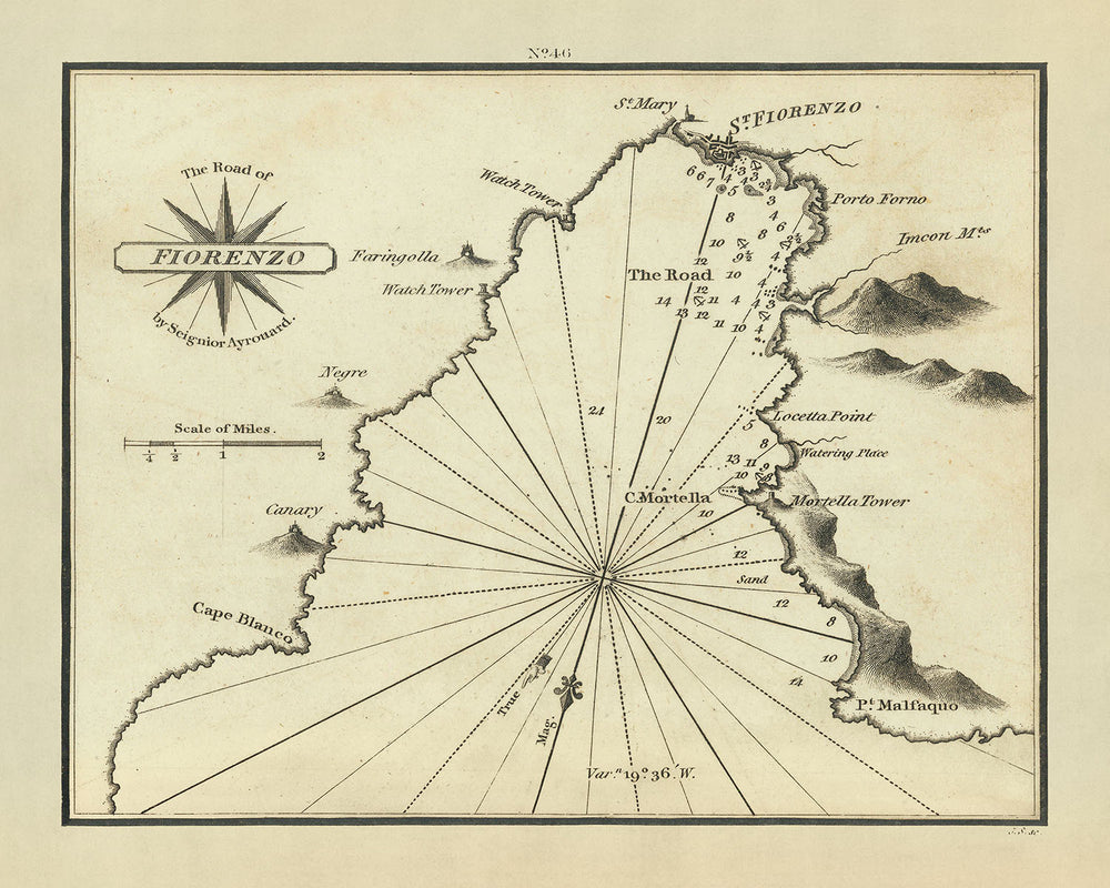 Beyond its navigational utility, "The Road of St. Fiorenzo" stands out as a work of art. The chart is finely engraved, a testament to the high standards of craftsmanship in London's cartographic circles during the early 19th century. Each line and lettering, possibly engraved by John Stephenson, reflects a meticulous attention to detail that elevates this chart to a visual delight. This artistic excellence, combined with the chart's rarity and historical context, makes it a prized possession for collectors and historians alike.